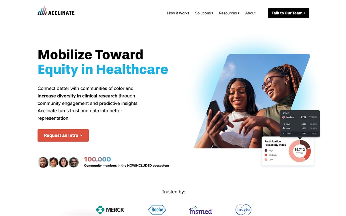 Acclinate increases clinical trial diversity through NOWINCLUDED, the community engagement arm of Acclinate and uses predictive analytics to provide valuable insights to pharmaceutical companies and other healthcare organizations. Acclinate provides access to communities of color, facilitates engagement around trials, and then analyzes the data generated to predict and plan where and when clinical research should happen.