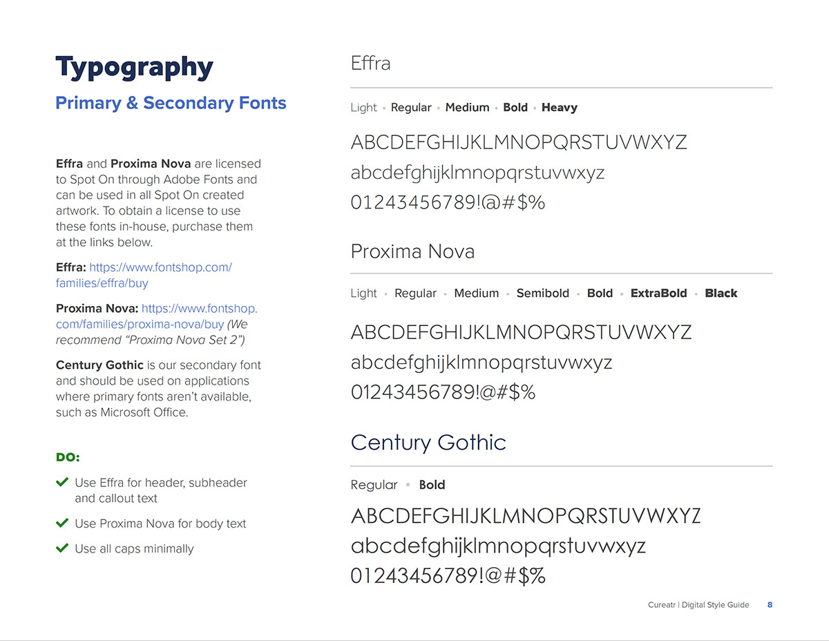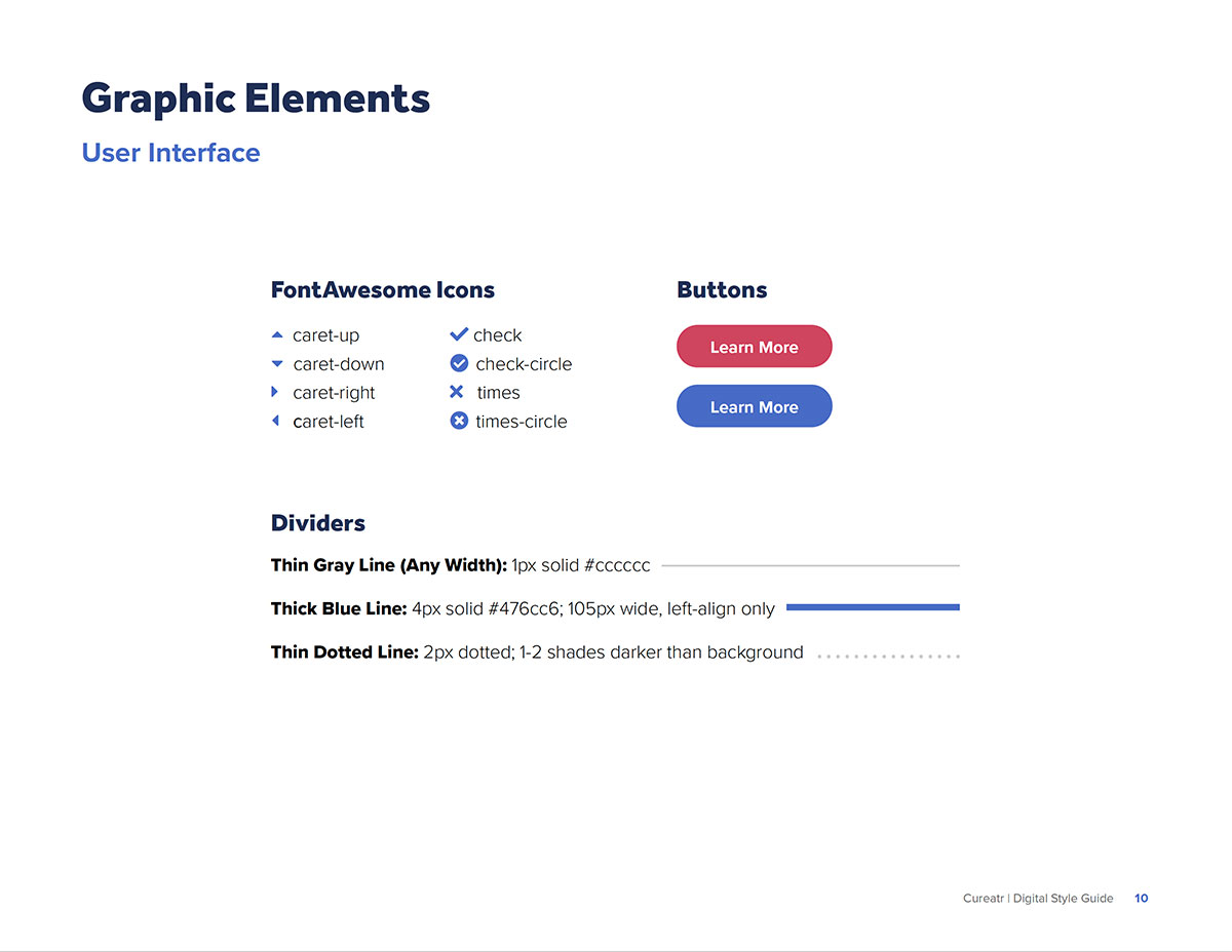 Cureatr requested an illustrated look for the design of the site and worked with Spot On to develop a 25-page web style guide. The guide covers the dos and don’ts of font selection, color pairings, user interface elements, iconography, and more to promote consistency across all digital collateral.